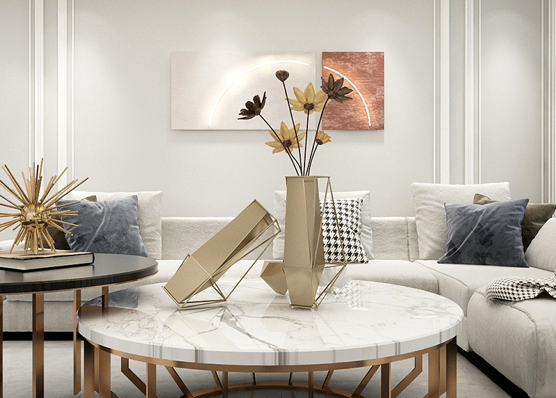 沙发背景墙的设计比较简单,更多注重的是实用美观的设计,客厅的整体比较紧凑,以白色和浅灰色为基调,搭配上浅色的沙发、金色的茶几和带有金属元素的配饰,凝聚出轻奢小资感。